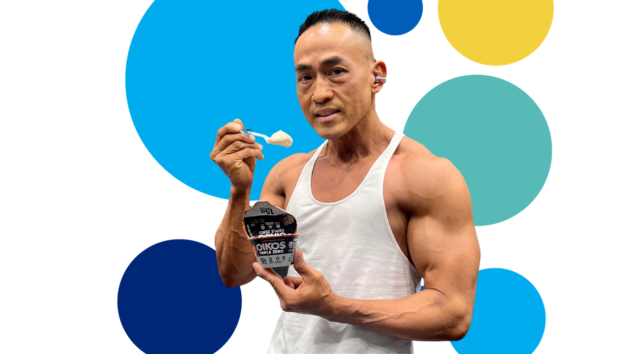 It’s also part of his fuel – Trung is a 50-year-old competition-winning bodybuilder. He regularly snacks on Oikos® Triple Zero Greek yogurt – another Danone yogurt brand – to help him meet the high protein needs his strict training diet requires.